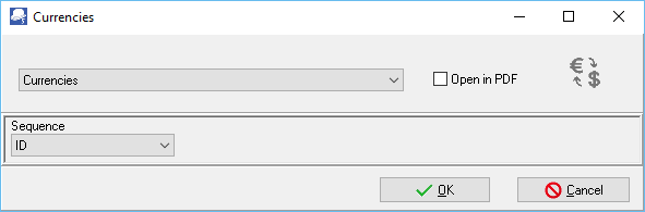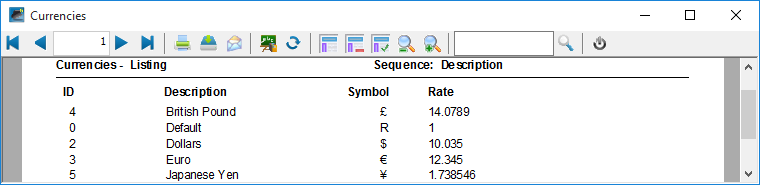 The Currencies report will list the currencies (added / edited in the Setup → Currencies menu on the Setup ribbon).