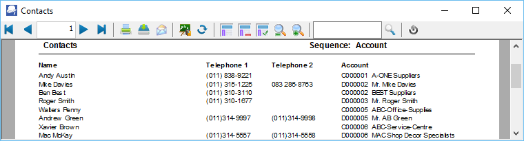 3.Click on OK. An example of the printed "Contacts" report, is as follows: