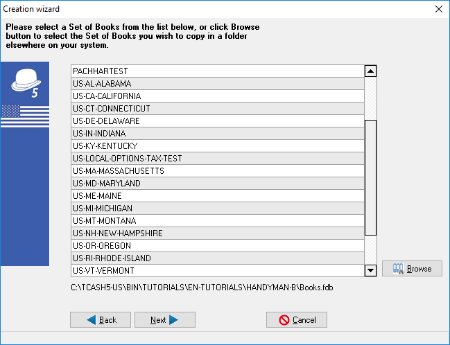 4.Select any of the available Set of Books on your system. If you do not find the Set of Books on the list, you may click on the Browse button to find a Set of Books from the "Pick a directory" screen.
