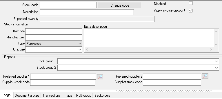 4.Enter theInventory code, Description, Barcode, Manufacturer and Extra description as required.