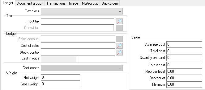 a)Tax class - If you have created tax classes, select the tax class. The Tax class will automatically add the Input Tax and Output Tax accounts in the Tax section, the Sales account, Cost of sales andInventory control accounts in the Ledger section.