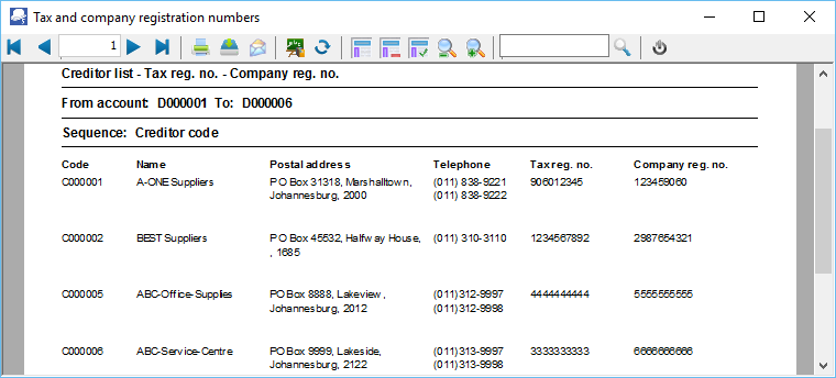 The Vendor listing - Tax and Company registration numbers report will list the Account code and Name (description), Telephone 1 and Tax registration number as well as the Company registration number for each of your vendor accounts.