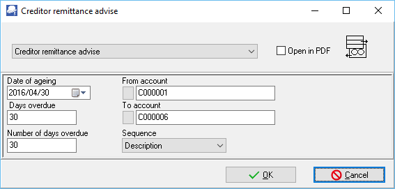 1.On the Reports ribbon, select Reports → Vendors → Outstanding. The Vendor remittance advice report options is displayed: