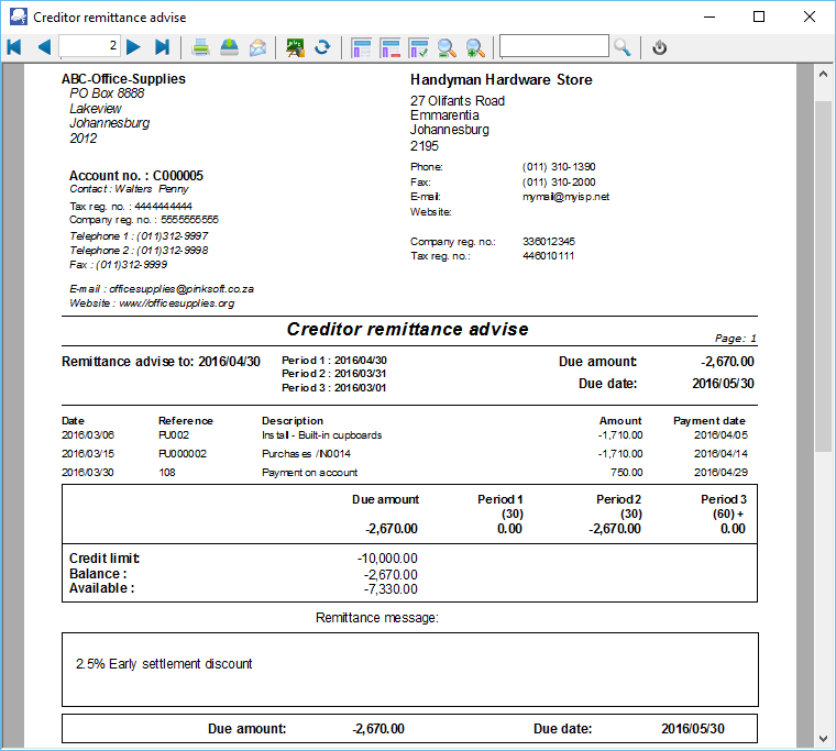 5.Credit limit - The amount as entered in the Credit limit field on the Accounting information tab of the vendor account. The Balance at is the current balance of the vendor account of all posted transactions and documents as at the date of printing of the Remittance advices. The Available amount is calculated the Credit limit minus the Balance at amount as at the date of printing of the Remittance advices.