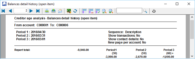 View the "Vendor age analysis - Balances detail history (open item)" ("Show contact details" and "Show transactions" option not selected) report: