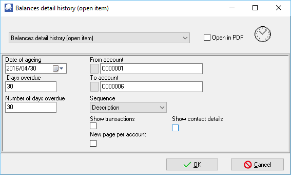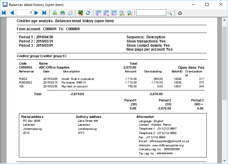 •Balances detail - Displays the reference, date, amount and description for each transaction. The Total outstanding as at the Date of aging is split to the number of days specified in up to 3 periods.