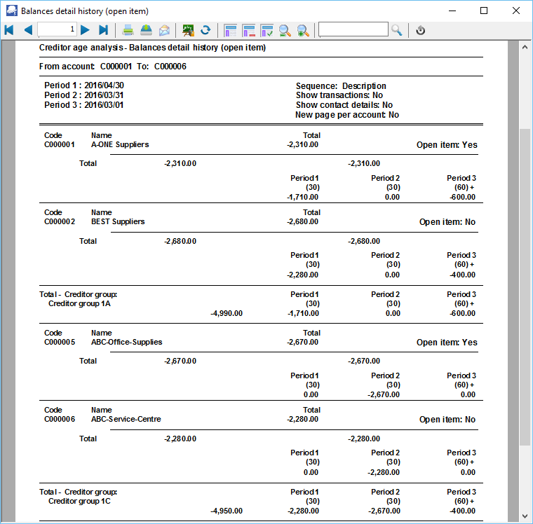 View the "Vendor age analysis - Balances detail history (open item)" ("Show transactions" option not selected) report: