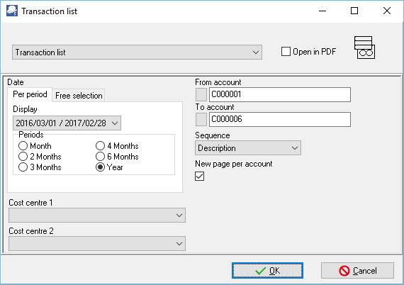 a)Period - Select a period on the Per period tab. You may click on the Free selection tab to select a specific date or a range of dates to include transactions in the report.