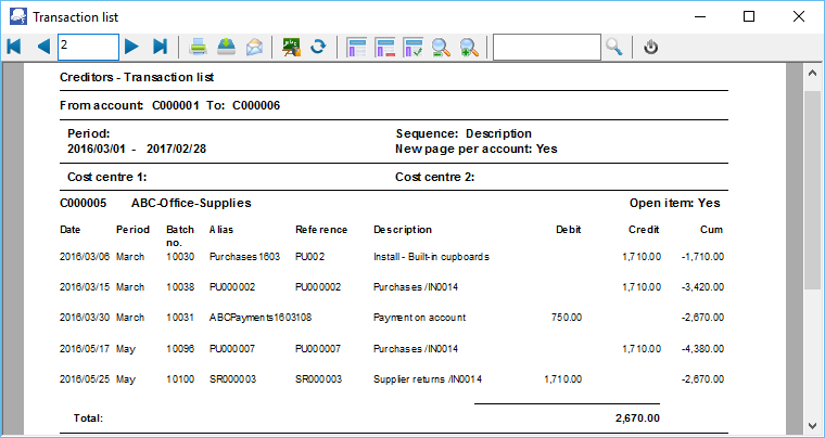 For example: •Payment - 108 - 2016/03/30 - 750.00 - Debit transaction in the Payments journal is linked to the supplier invoice PU002 - 2016/03/06 -1710.00. The outstanding amount for this transaction is 960.00 still due to the vendor. (1710.00 minus 750.00). Only 960.00 will be listed •Supplier return SR000003 - 2015/05/25 - 1710.00 is linked to Purchase PU000007 - 2015/05/17 - 1710.00. Supplier return SR000003 and Purchase PU000007 will not be listed on the "Transaction list - Open item" report as well as the "Vendor remittance advice - Outstanding". |