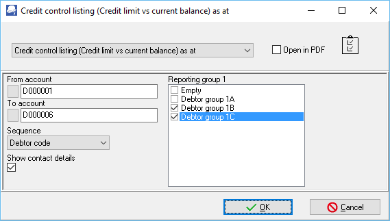 b)Sequence - Select "Customer code Description, Credit limit or Disabled" to print the report details in the order (sort) in which you wish to display the data.