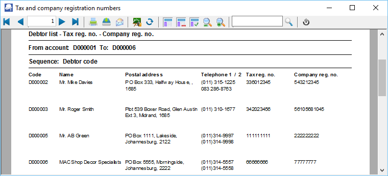 The Customer listing - Tax and Company registration numbers report will list the Account code and Name (description), Telephone 1 and Tax registration number as well as the Company registration number for each of your customer accounts.