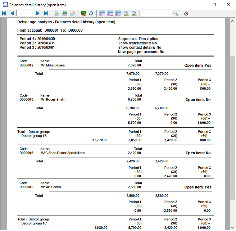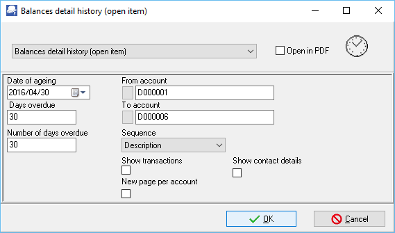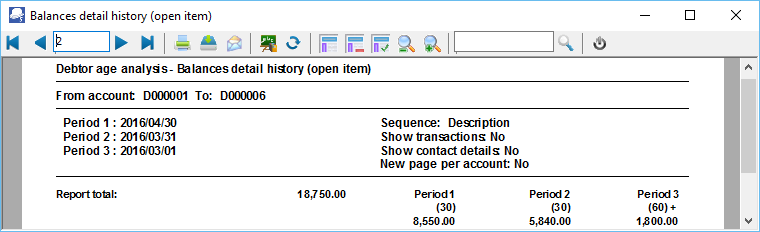 Balances detail history (open item) - Displays the reference, date, amount and description for each transaction. The Total outstanding as at the Date of aging is split to the number of days specified in up to 3 periods.