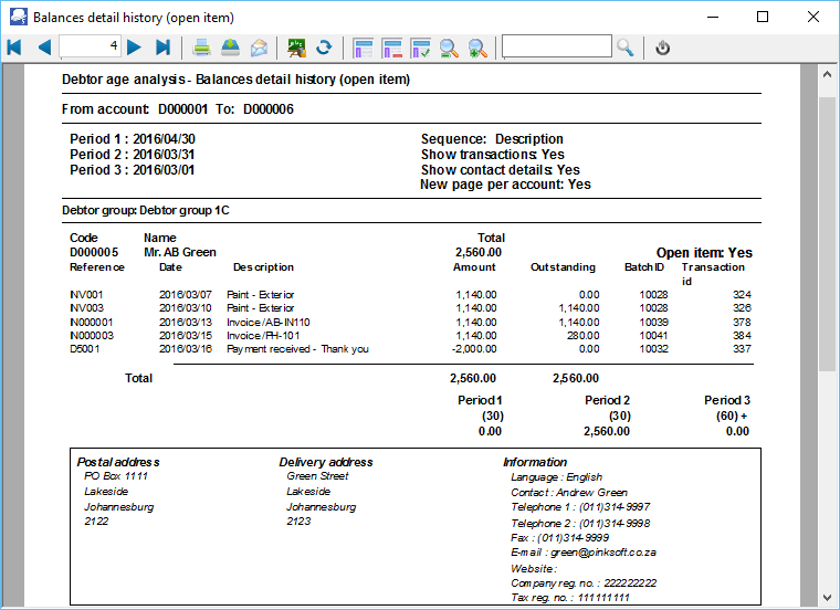 g)Show contact details - If this option is not selected (not ticked), it will list only the transactions. Tick this option to include the details (i.e. postal address, delivery address, and contact details). You may select this option, if the for the balances or transactions (Show transactions option ticked or not).