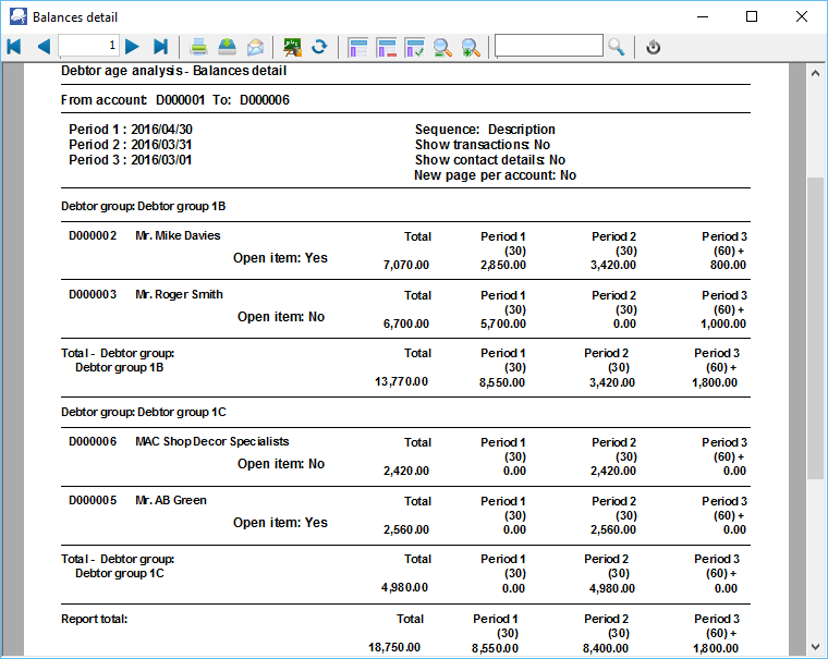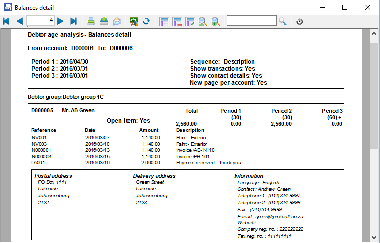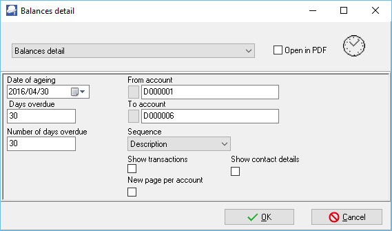 •Balances detail - Displays the reference, date, amount and description for each transaction. The Total outstanding as at the Date of aging is split to the number of days specified in up to 3 periods.