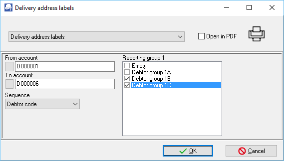 c)Reporting group 1 - Select a reporting group or more reporting groups. The address labels will only be printed for those customer accounts linked to the selected Customer reporting group 1.