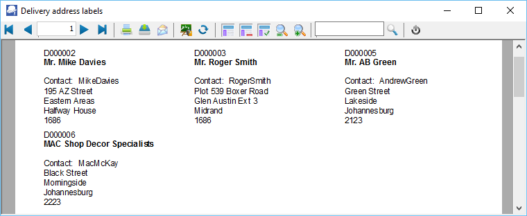 1.Delivery address - This will print the Account code, Account description, Contact name and Delivery address for each selected customer account.