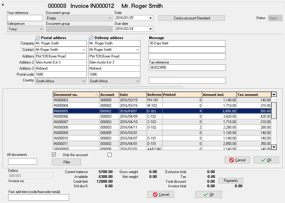 By default, the Only this account option will be selected (ticked). This means that only those documents generated for the selected customer or the vendor in the Document Head will be listed. You may filter and search for documents using the following values: •Document number - Enter a valid document number and click on the Filter button. •Only this account - Deselect (remove the tick) this option and click on the Filter button to list all documents of customer or vendor accounts. •All documents - Select (tick) this option and click on the Filter button to list all sales documents and purchase documents. |