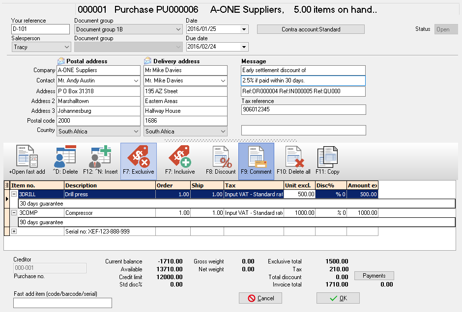 h)Message - The message, as entered in the Documents setup - Purchases tab (Setup ribbon) will be displayed. You may edit / enter messages to be printed on the document layout file.