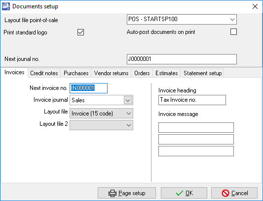TurboCASH has set default journal types for all the documents. You may also specify the heading, message, and whether you wish to print the logo, if you have set it up.