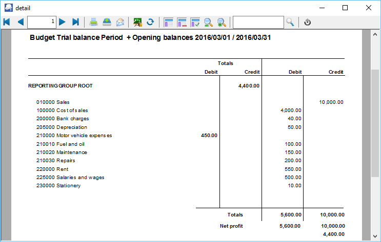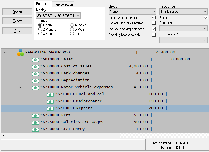 The "Budget" option, if selected, will list only the budget figures (Budget listing) in the Trial balance, Income statement, Balance sheet and Standard column balances report types.