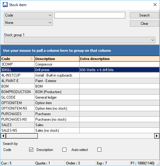 1.Code - Code is the default option. You may select the Description, Barcode, Description and extra description or Code, Description and extra description option. This will allow you to enter any valid values for a inventory item. If you click on the Search button, it will list only those inventory items matching the value entered.