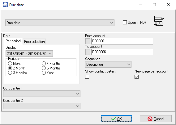 b)Period - Select a period on the Per period tab. You may click on the Free selection tab to select a specific date or a range of dates to include transactions in the report. All the transactions which are outstanding on or before the end date of the periods will be listed.