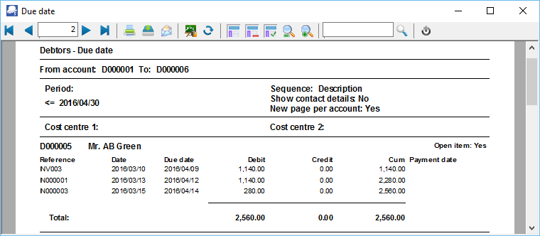 Due date - This report will list all the transactions before and on a selected period (date). It will list the details for each transaction (i.e. Reference No., Date, Due date, Debit, Credit and the accumulative balance for each of the customer accounts.