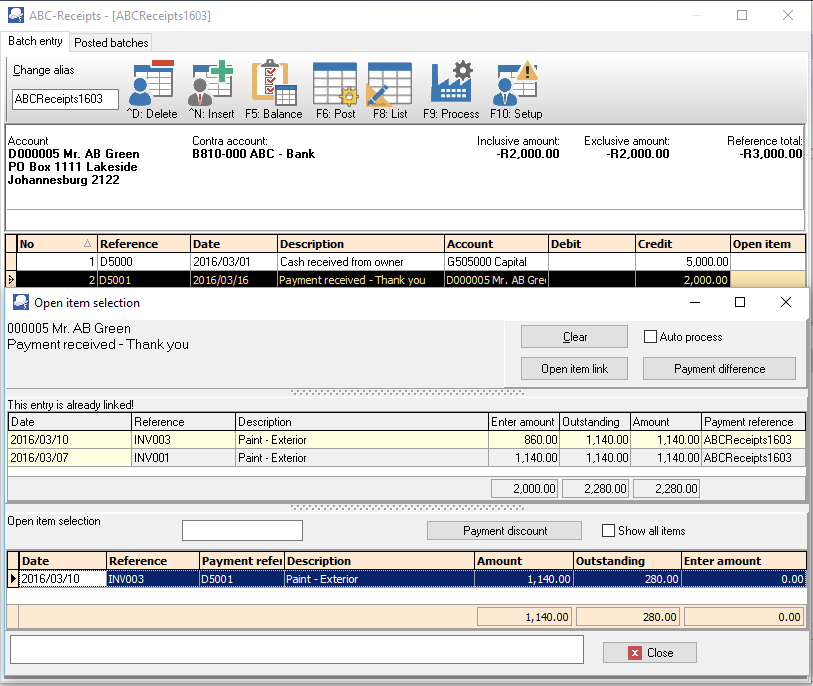 You may also select an account on the Journal entry screen (right-click on selected transaction) and select the "Select from account open item list" option. The "Open item selection" screen will list the unlinked transactions as well as transactions with outstanding amounts.