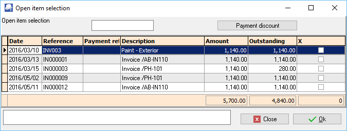When processing transactions in journals and an open item account is selected, the “Open item selection” screen list all the outstanding transaction. For example, if a payment is received, you may select to link the receipt to outstanding amount(s) in journals as well as documents.