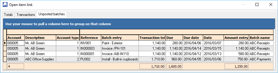 The Unpostedjournals tab will list all transactions linked to open item accounts (i.e. ledger, customers and vendors) in journals, which have not yet been posted (updated) to the ledger. The transactions in unposted journals for open item accounts need to be linked to transactions in posted journals.