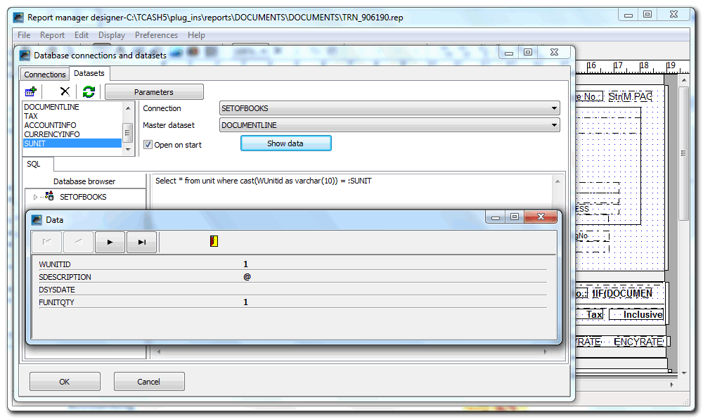 7.Paste the following sql in the SUNIT sql box " Select * from unit where cast(WUnitid as varchar(10)) = :SUNIT "