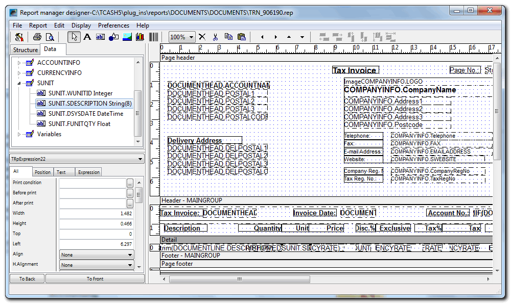 10.Select the Detail section of the document lines. To insert the expression, simply drag the SUNIT.SDESCRIPTION field to the place to be displayed on the layout file.