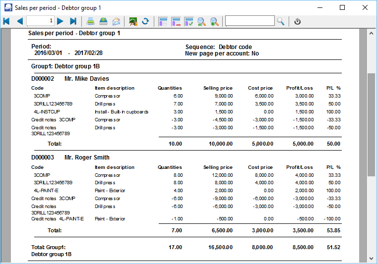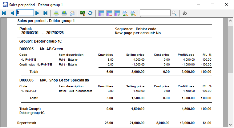 An example of the Sales per period - Customer group 1 report, is as follows: