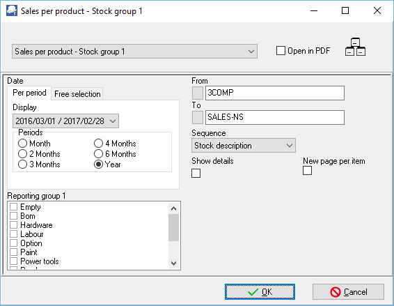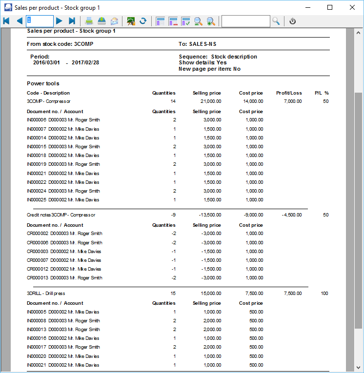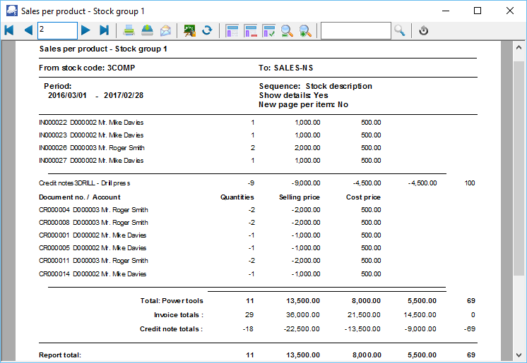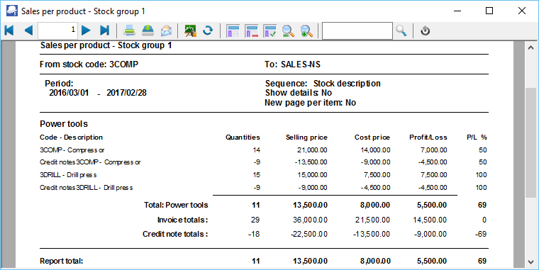 An example of the Sales per product - Inventory group 1 (no details) report, is as follows: