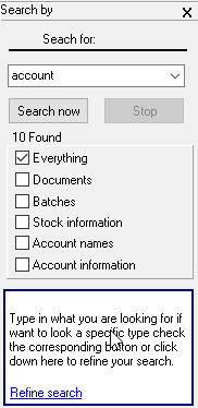 SERIAL TRACKING - If you have entered a serial number of a product (inventory item) as a comment on your sales documents (Invoices, Credit notes and / or Estimates) and / or on Purchase documents (Purchases and Supplier returns and / or Orders), you may enter the serial number in the Search For: field. If you click on the Search now button, the Documents will be listed. You may then double-click on the selected document to preview the document. |