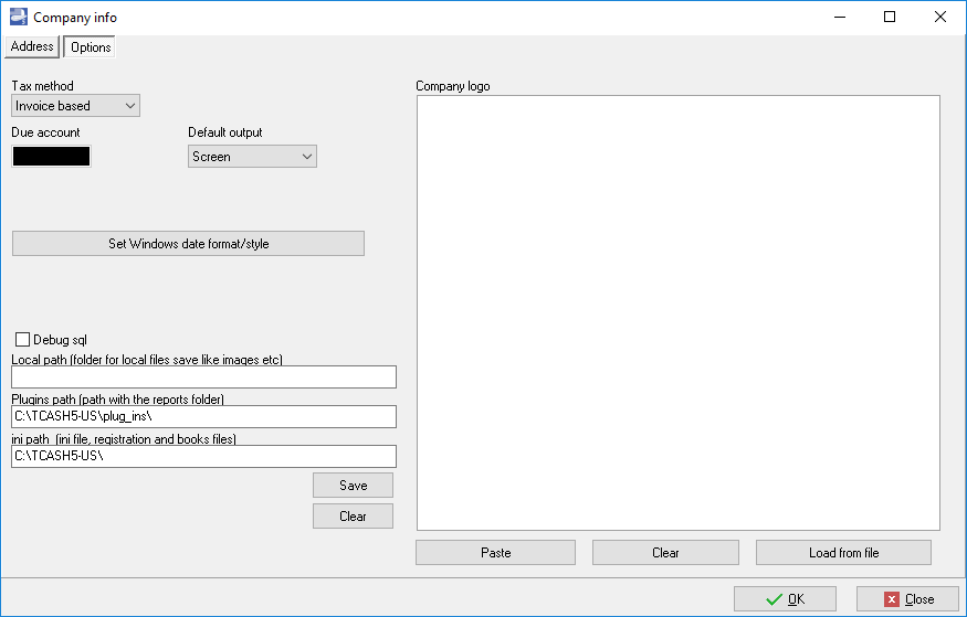 4.Click on the Options button. The Company info - Options screen is displayed: