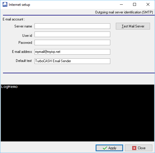 This option allows you to set your Internet in order to send reports, statements and lists to any person or institution by e-mail. You need to specify your e-mail's outgoing mail server as your Internet Service Provider has set up your e-mail account on your computer system. You may also test your e-mail server, and view the test log file from this option.