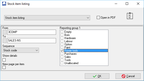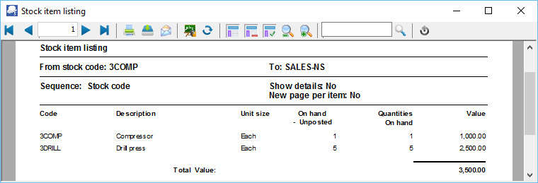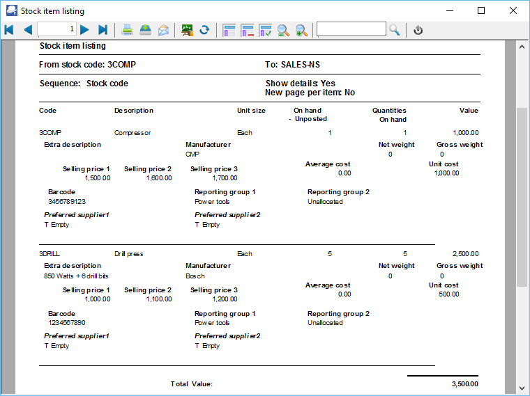Inventory item listing - Displays a list of the inventory items and the quantities and cost prices. The details option will display the Extra description, Manufacturer, Unit size, Gross and net weight, Selling price 1 / 2 / 3, Average cost, Unit cost, Barcode, Reporting group 1 / 2, Preferred supplier 1 and Supplier 1's Inventory code.