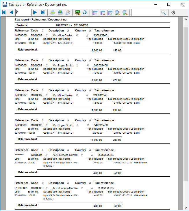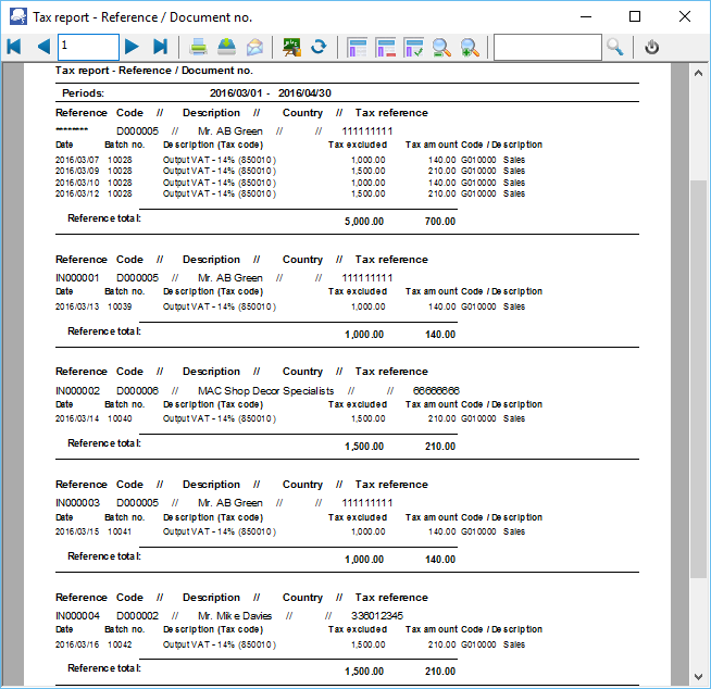 An example of the printed "Tax report - Reference / Document no.", is as follows:
