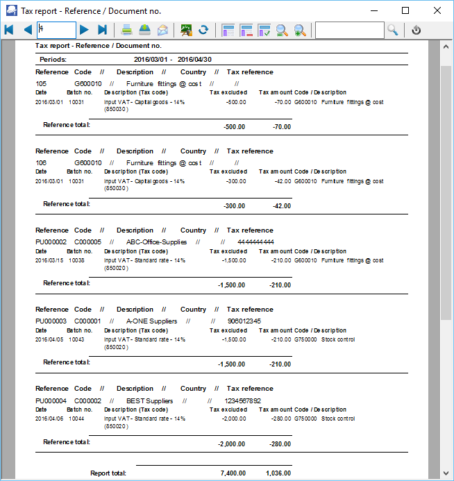 The Tax excluded and Tax amount in the Report total of the Tax report - Reference / Document no. report, should balance with the Total - Output tax – Input tax of the Tax per period report, if the same periods are selected. |
