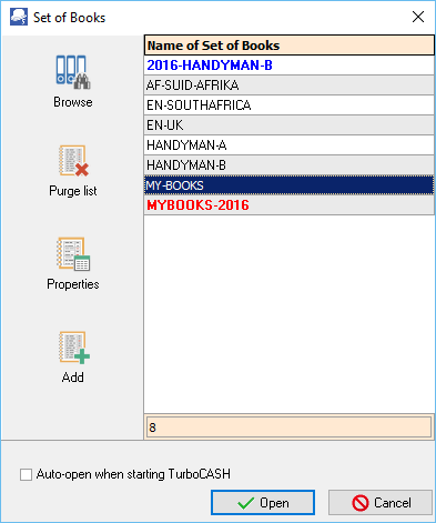 If a Set of Books is not located in the TCASH5/books or other directory where TurboCASH is installed, (elsewhere on your system) the name of the Set of Books is displayed in a blue color. |